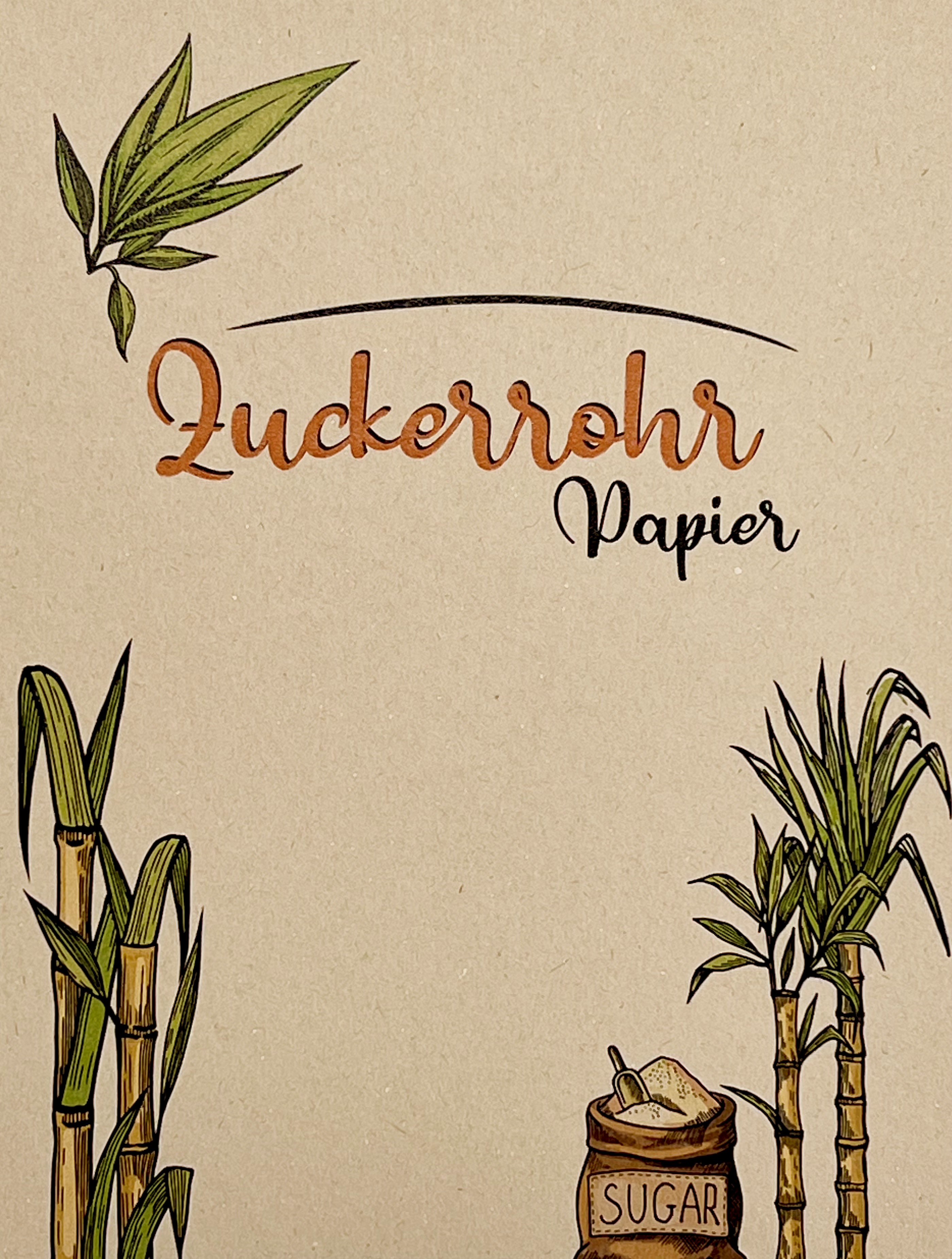 Die Faltblätter DIN A5, wahlweise aus 90g, 150g oder 200g starkem Zuckerrohrpapier (das entspricht einer herkömmlichen Papierstärke von 110g, 180g oder 250g), überzeugen durch eine leicht cremige Papierfärbung und schöne Haptik.
